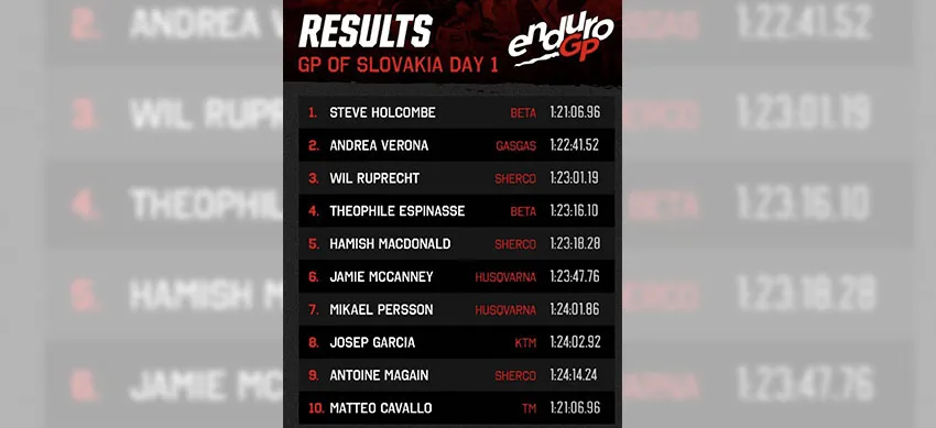 C'est Steve Holcombe pour cette première journée du côté de Gelnica en Slovaquie qui après plus d'1 h 20 chronos a remporté la victoire devant Andrea Verona et Wil Ruprecht. En E1 c'est Théo Espinasse qui s'est imposé alors qu'en Youth c'est Thibault Giraudon.